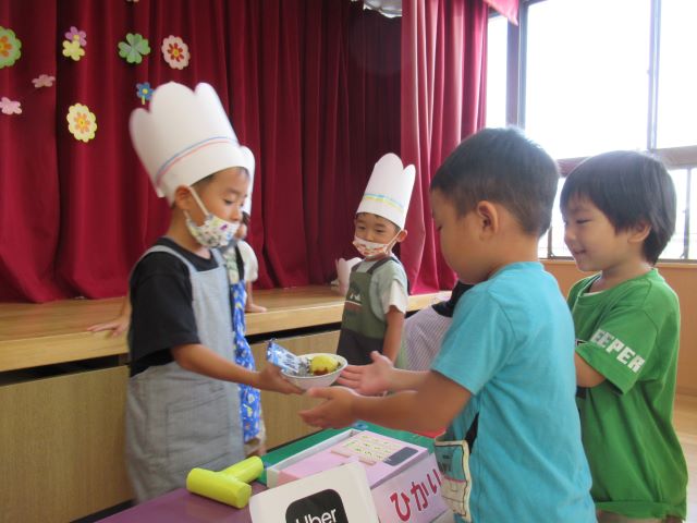 そして、「スィートポテト」のクッキングをしました。年長児さんはお店屋さんにも