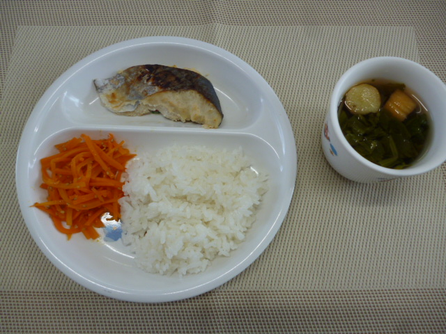 今日の給食は、「さわらの西京焼き」、「にんじんのごま炒め」と「菜の花のすまし汁」