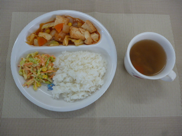 今日の給食は、「厚揚げのケチャップ煮」、「コールスローサラダ」と「きのこのスープ」 おやつは、「牛乳」と「しらすトースト」です。