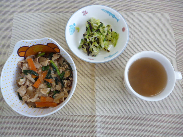 今日の給食は、「プルコギ丼」、「キャベツの昆布和え」と「中華スープ」