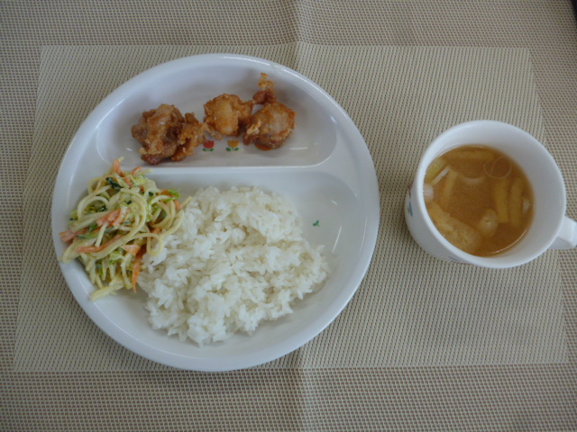 今日の給食は、「鶏のから揚げ」、「パスタサラダ」と「小松菜のみそ汁」 おやつは、「牛乳」、「オレンジ」と「ぽたぽた焼き」です。