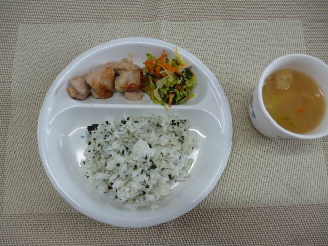 令和3年5月7日(金)の献立 2021/05/07 今日はお誕生日会です🍰 5月生まれのお友達、お誕生日おめでとう✨ 今日の給食は、「わかめごはん」、「鶏肉の照り焼き」、「キャベツの磯和え」と 「油揚げと白菜のみそ汁」 おやつは、「牛乳」、「ハニーケーキ」と「動物ビスケット」です。