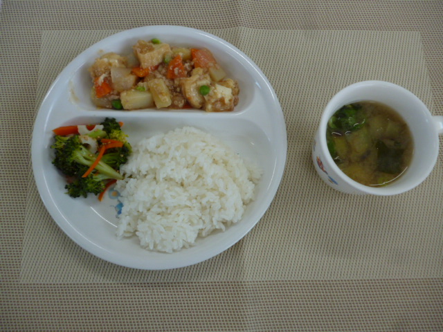 今日の給食は、「厚揚げとじゃが芋のそぼろ煮」、「ブロッコリーのごま酢和え」と「なすのみそ汁」 おやつは、「牛乳」、「りんご」と「ぼんち揚げ」です。