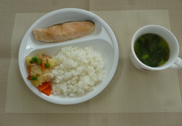 今日の給食は、「鮭の塩焼き」、「じゃが芋とひき肉の煮物」と「小松菜のみそ汁」