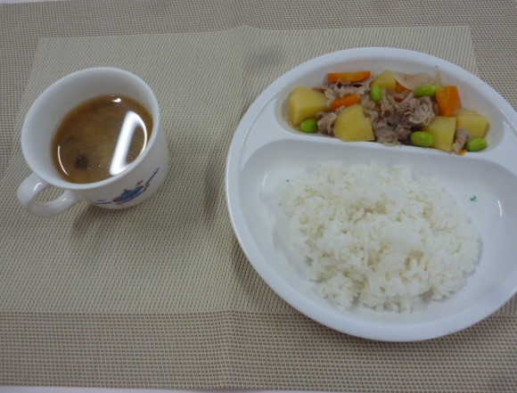 今日の給食は、「豚肉と野菜の旨煮」と「みそ汁」 おやつは、「牛乳」と「お楽しみおやつ」です。