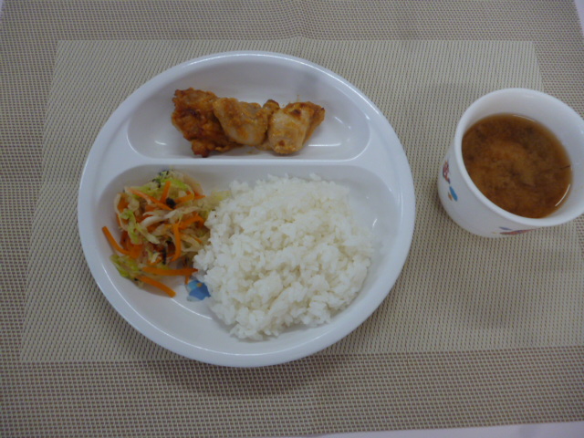 今日の給食は、「鶏肉のもみじ焼き」、「キャベツの磯部和え」と「玉ねぎのみそ汁」 おやつは、「牛乳」、「バナナ」と「新潟仕込み」です。