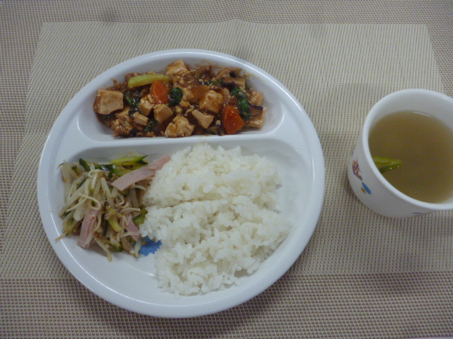 令和3年10月25日(月)の献立 2021/10/25 今日の給食は、「豚肉と豆腐の味噌炒め」、「もやしときのこの中華和え」と「はるさめスープ」 おやつは、「牛乳」、「バナナ」と「ハッピーターン」です。