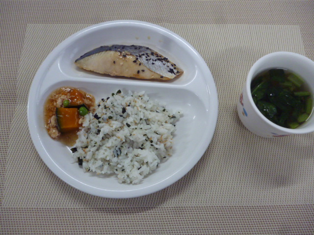 今日の給食は、「わかめごはん」、「さわらのごま照り焼き」、「かぼちゃのそぼろあんかけ」と