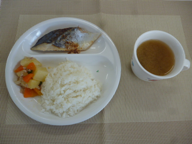今日の給食は、「さわらの西京焼き」、「じゃが芋とひき肉の煮物」と「小松菜のみそ汁」 おやつは、「牛乳」、「五平もち」と「ぽりぽり小魚」です。