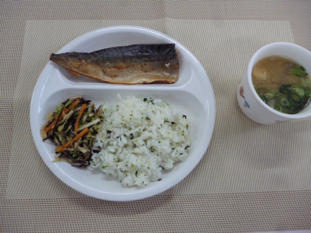 今日の給食は、「菜飯」、「さばの塩焼き」、「キャベツとひじきのおかか和え」と「五目みそ汁」