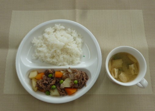 今日の給食は、「肉じゃが」と「小松菜のみそ汁」