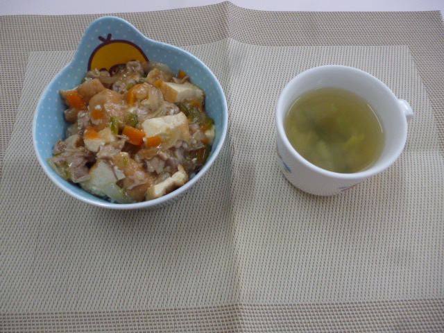 今日の給食は、「厚揚げの中華丼」と「白菜のスープ」 おやつは、「牛乳」と「お楽しみおやつ」です。