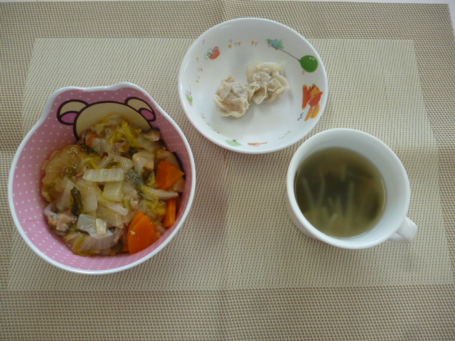 今日の給食は、「中華丼」、「シュウマイ」と「中華スープ」 おやつは、「牛乳」と「お楽しみおやつ」です。