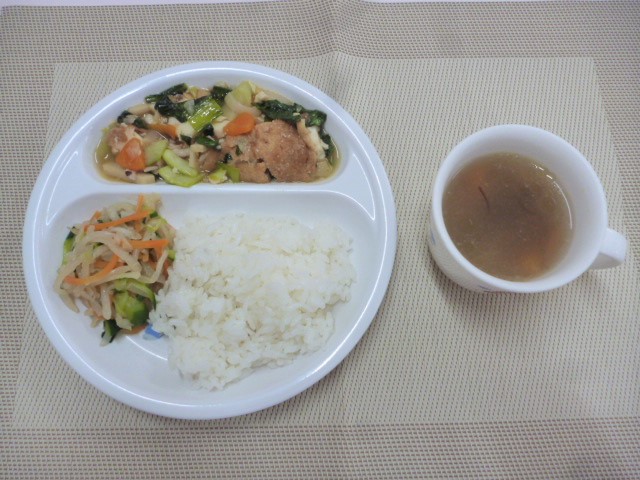 今日の給食は、「厚揚げチャンプルー」、「もやしのナムル」と「もずくスープ」