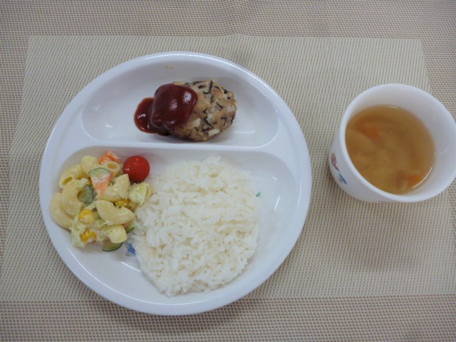 令和4年8月19日(金)の献立 2022/08/19 今日の給食は、「豆腐ハンバーグ」、「マカロニサラダ」と「きのこのスープ」 おやつは、「牛乳」、「パイン缶」と「マリービスケット」です。 ★ひかり組さんが栽培・収穫したミニトマトを添えました🍅