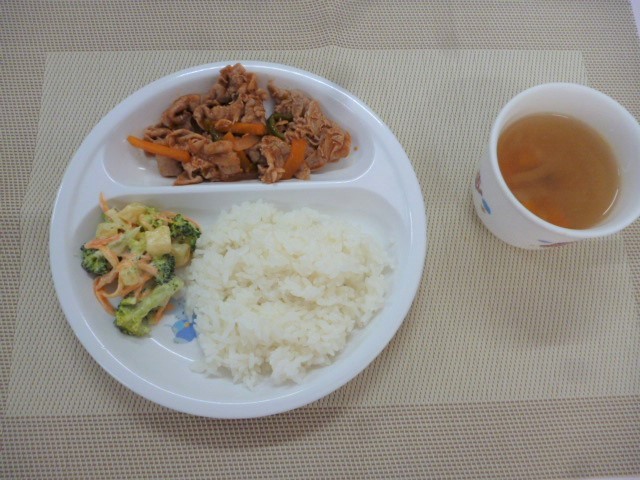 今日の給食は、「ポークチャップ」、「蒸し野菜サラダ」と「コンソメスープ」