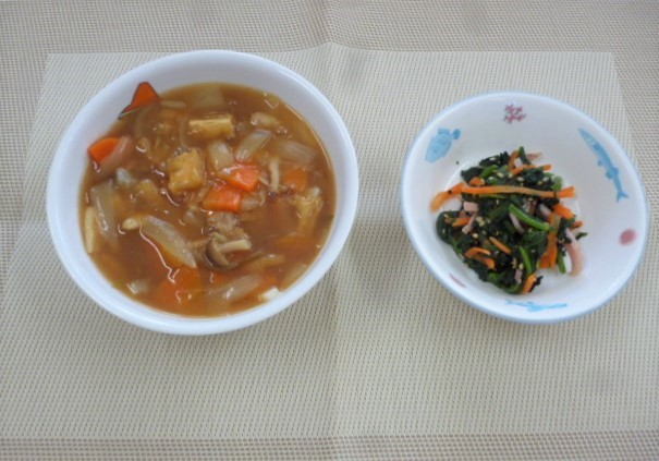 令和4年11月5日(土)の献立 2022/11/05 今日の給食は、「カレーうどん」と「ほうれん草とハムのごま酢和え」 おやつは、「牛乳」と「お楽しみおやつ」です。 ★「カレーうどん」、「ほうれん草とハムのごま酢和え」は新メニューです🍴