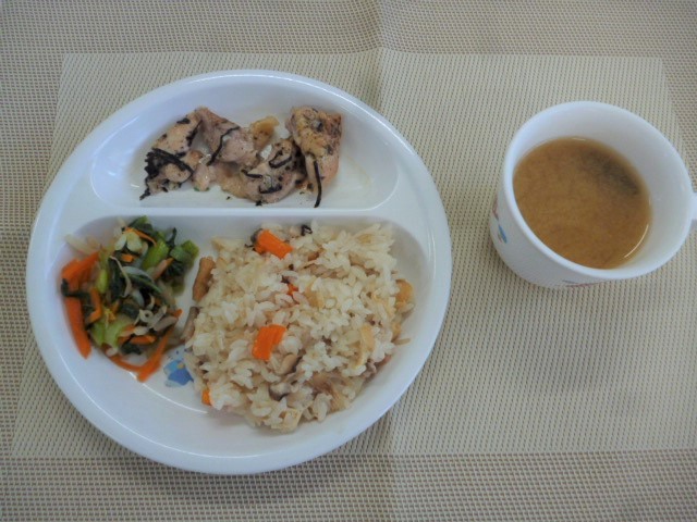 今日の給食は、「きのこごはん」、「鶏肉ののり焼き」、「チンゲン菜のさっぱり和え」と