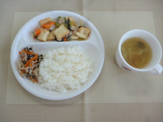 令和4年11月10日(木)の献立 2022/11/10 今日の給食は、「厚揚げの中華炒め煮」と「もやしの磯和え」と「中華スープ」 おやつは、「牛乳」、「牛乳みかん寒天」と「チーズ」です。 ★おやつの「ソフトせんべい」は、昨日の「チーズ」と入れ替えになりました。