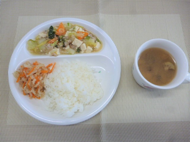 今日の給食は、「豆腐と白菜の旨煮」、「切干大根のごま和え」と「なすのみそ汁」 おやつは、「牛乳」、「みかん」と「ハッピーターン」です。