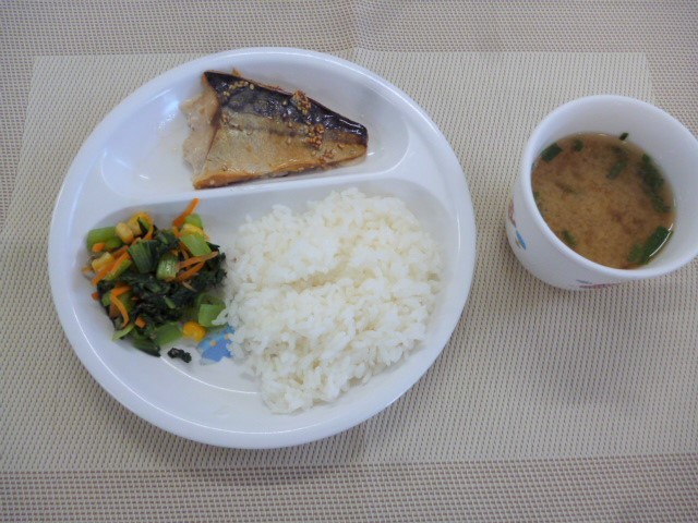 今日の給食は、「さばのごま焼き」、「小松菜のおかか和え」と「さつまいものみそ汁」
