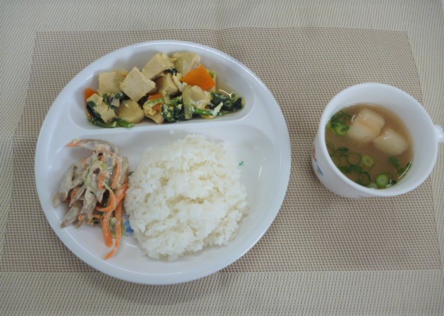 今日の給食は、「高野豆腐のふわふわ煮」、「ごぼうとツナの和え物」と「白菜のみそ汁」 おやつは、「牛乳」、「りんご」と「新潟仕込み」です。