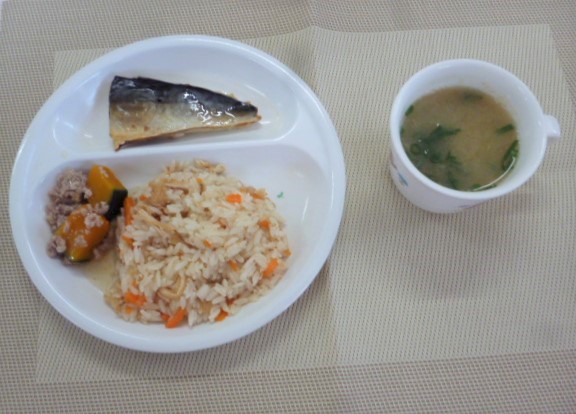今日の給食は、「油揚げとにんじんの混ぜごはん」、「さばの塩焼き」、