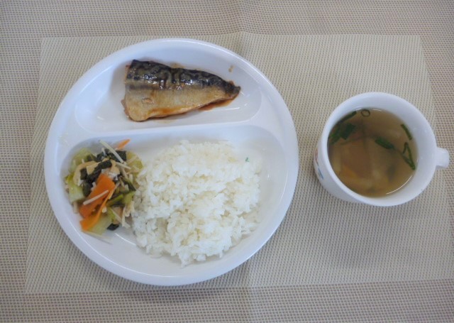 今日の給食は、「さばのみそ煮」、「チンゲン菜とあげの煮浸し」と「五目汁」