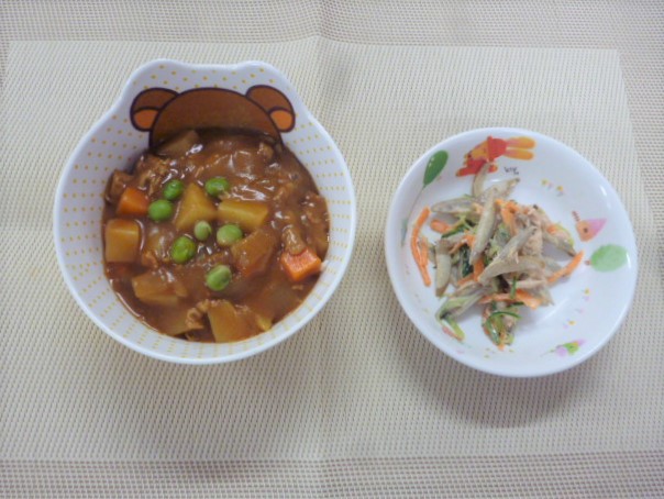 今日の給食は、「ポークカレーライス」と「ごぼうサラダ」 おやつは、「牛乳」と「セサミサンド」です。