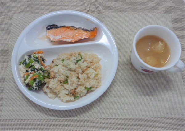 今日の給食は、「とりそぼろ混ぜごはん」、「鮭の塩焼き」、「小松菜の白和え」と「具沢山みそ汁」