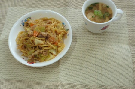 今日の給食は、「焼きそば」と「なすのみそ汁」 おやつは、「牛乳」と「お楽しみおやつ」です。