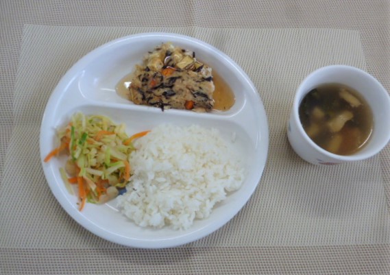 今日の給食は、「豆腐の五目焼き」、「キャベツのおかか和え」と「小松菜のすまし汁」 おやつは、「牛乳」、「みたらし団子」と「ぽりぽり小魚」です。