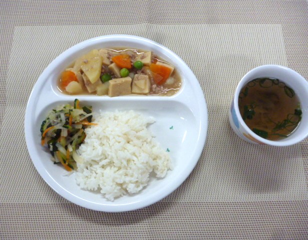 今日の給食は、「高野豆腐のそぼろ煮」、「大根のナムル」と「キャベツのすまし汁」