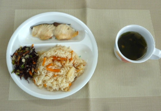 令和5年4月20日(木)の献立 2023/04/20 今日の給食は、「たけのこごはん」、「さわらの塩焼き」、「キャベツとひじきのおかか和え」と 「豆腐のすまし汁」 おやつは、「牛乳」と「コーンマヨトースト」です。