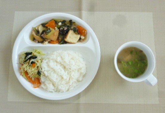 今日の給食は、「厚揚げの野菜あんかけ」、「キャベツの和風和え」と「もやしのみそ汁」