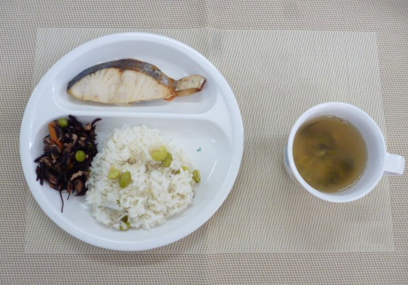 令和5年8月8日(火)の献立 2023/08/08 今日の給食は、「えだまめごはん」、「さわらの塩焼き」、「ひじきの炒め煮」と「豆腐のすまし汁」 おやつは、「牛乳」、「バナナ」と「新潟仕込み」です。 ★つき組さんは、「えだまめごはん」を自分たちで握って食べました🍙
