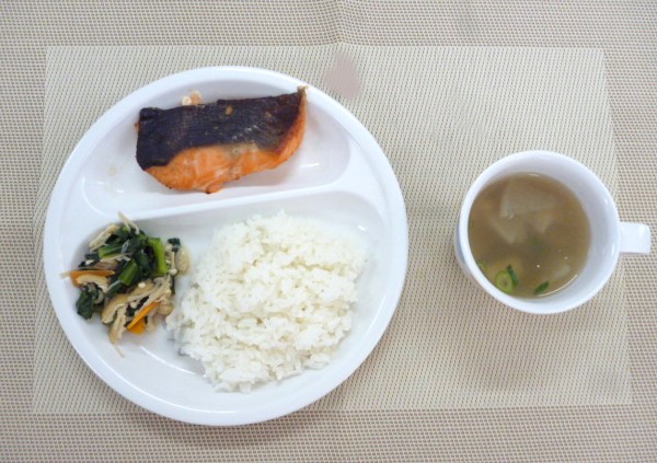 今日の給食は、「鮭の西京焼き」、「小松菜とあげの煮びたし」と「けんちん汁」