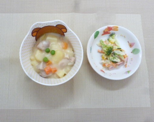 今日の給食は、「クリームシチュー」と「蒸し野菜のサラダ」 おやつは、「牛乳」と「揚げパン」です。