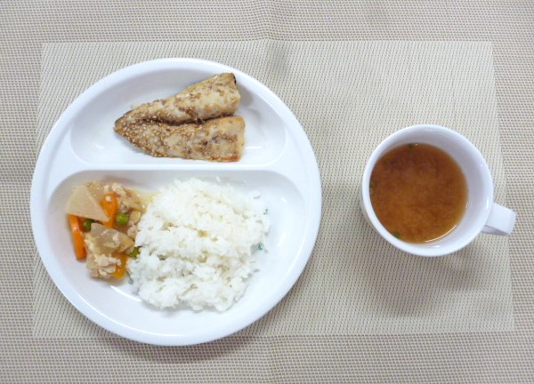 今日の給食は、「さばのごま焼き」、「大根とあげのあんかけ煮」と「じゃがいものみそ汁」