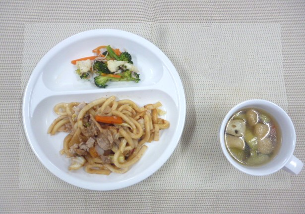 令和5年11月10日(金)の献立 2023/11/10 今日の給食は、「焼うどん」、「花野菜とじゃこのお浸し」と「青菜のすまし汁」 おやつは、「牛乳」、「柿」と「ぽたぽた焼」です。 ★「焼きうどん」は、新メニューです🍴
