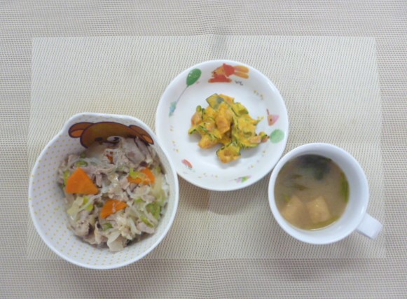 今日の給食は、「ねぎ塩豚丼」、「かぼちゃサラダ」と「ほうれん草のみそ汁」 おやつは、「牛乳」、「みかん」と「ハッピーターン」です。