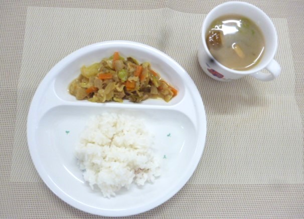今日の給食は、「豚肉のカレー野菜炒め」と「豆腐のみそ汁」 おやつは、「牛乳」と「お楽しみおやつ」です。