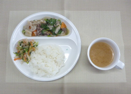 令和5年11月28日(火)の献立 2023/11/28 今日の給食は、「牛肉とれんこんの炒め物」、「もやしと豆苗のごま和え」と「厚揚げのみそ汁」 おやつは、「牛乳」、「黒糖蒸しパン」と「動物ビスケット」です。
