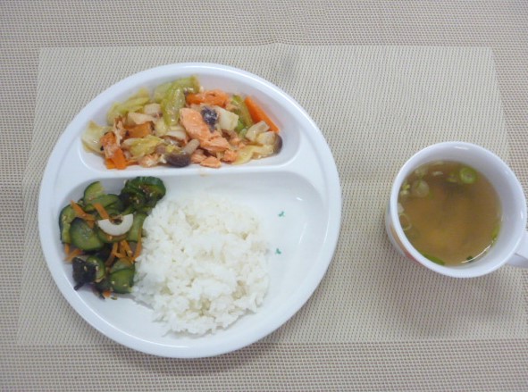 令和5年11月30日(木)の献立 2023/11/30 今日の給食は、「鮭のちゃんちゃん焼き」、「きゅうりの酢の物」と「豆腐のすまし汁」 おやつは、「牛乳」、「マカロニきなこ」と「チーズ」です。 ★おやつの「セサミマカロニ」は、「マカロニきなこ」に変更となりました。
