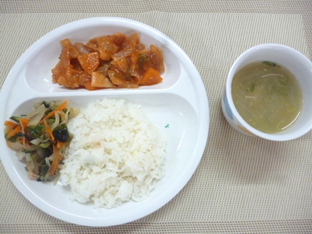 令和5年12月1日(金)の献立 2023/12/01 気づけば今日から12月・・・ あっという間に年末を迎えそうですね! 今日の給食は、「酢鶏」、「大根のナムル」と「中華風コーンスープ」 おやつは、「牛乳」、「オレンジ」と「雪の宿」です。 ★「酢鶏」は新メニューです🍴