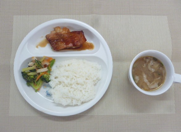 今日の給食は、「煮魚」、「ブロッコリーのごま和え」と「芋煮風汁」 おやつは、「牛乳」、「こんぶとツナのおにぎり」と「ぽりぽり小魚」です。