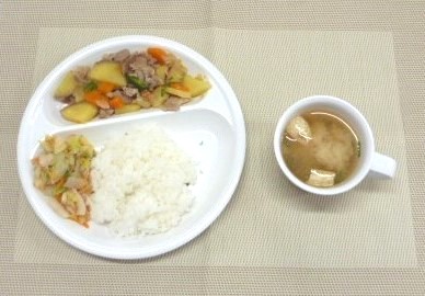 令和5年12月22日(金)の献立 2023/12/22 今日の給食は、「豚肉とさつま芋の甘辛炒め」、「白菜とツナの和風サラダ」と「豆腐のみそ汁」 おやつは、「牛乳」、「りんご」と「きなこ餅せんべい」です。