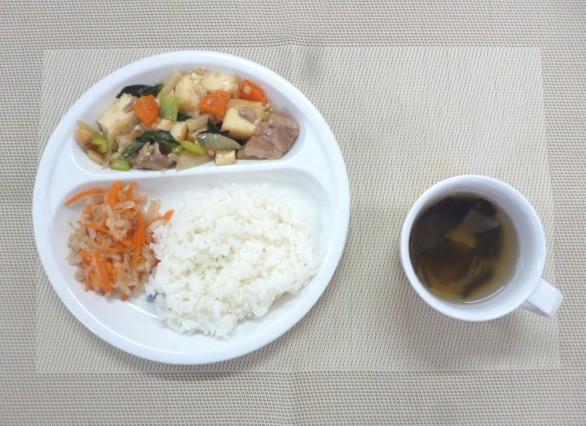 令和5年12月27日(水)の献立 2023/12/27 今日の給食は、「厚揚げの中華煮」、「もやしと切干大根のお浸し」と「じゃがいものすまし汁」 おやつは、「牛乳」、「キャロットゼリー」と「ソフトせんべい」です。 ★明日の献立と入れ替わりました。 ★今日の「ソフトせんべい」は、「新潟仕込み」です。
