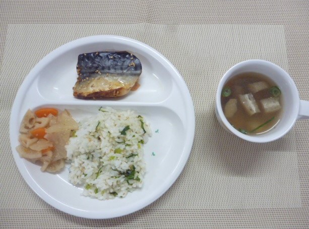 今日の給食は、「七草ごはん」、「さばのごま照り焼き」、「炒めなます」と「けんちん汁」
