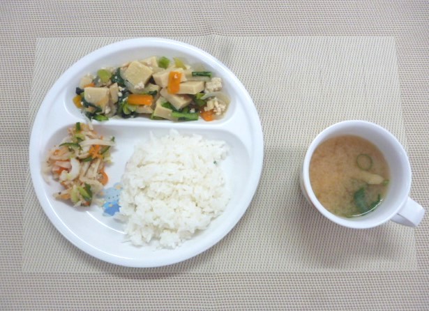 今日の給食は、「高野豆腐のそぼろ煮」、「切干大根のごま酢和え」と「玉ねぎのみそ汁」